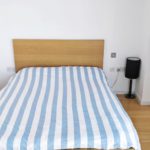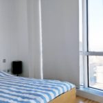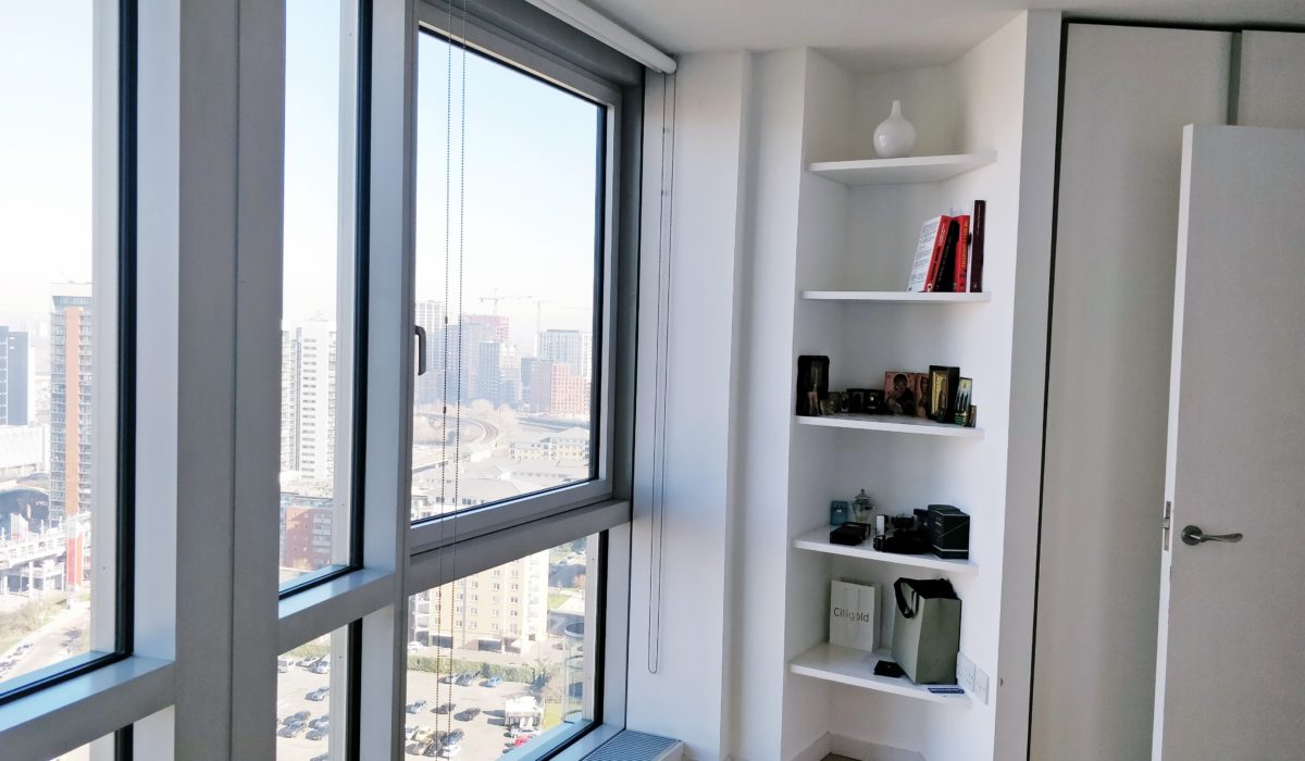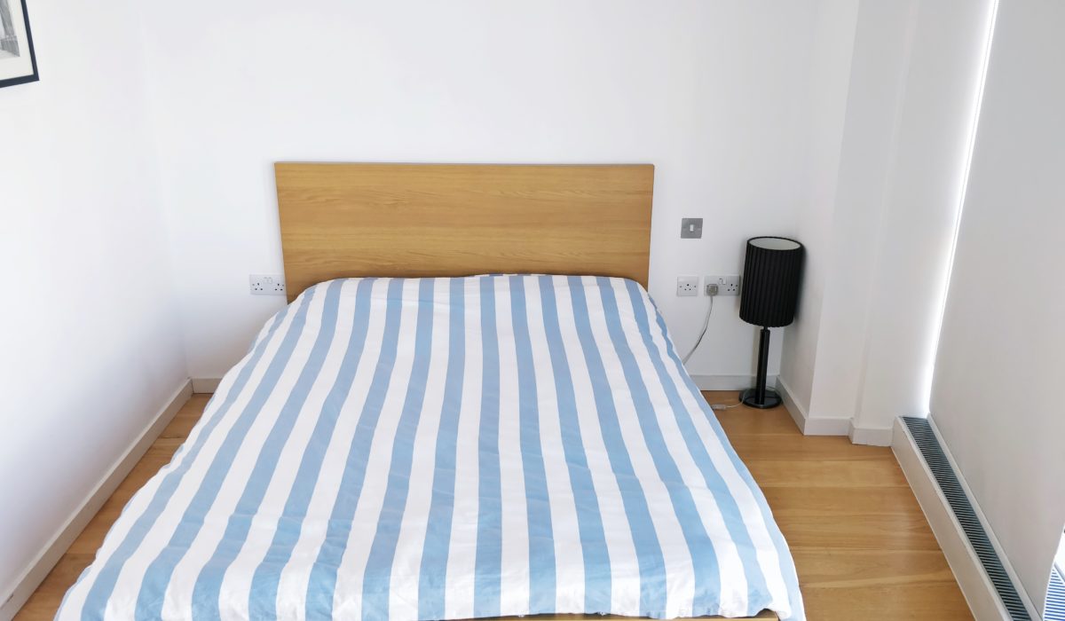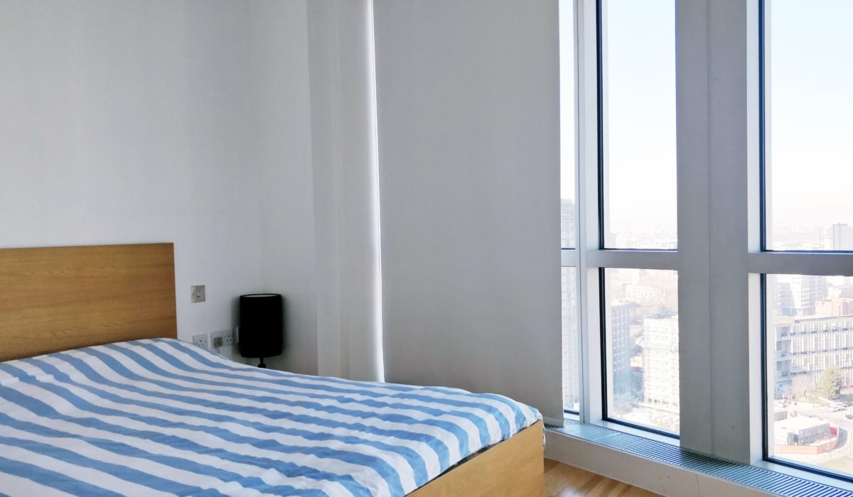 Curved shaped with wood flooring throughout, underfloor heating, double bed, built-in wardrobe, floor to ceiling double glazed windows offering spectacular views of the London skyline, neutral decor, various power sockets.