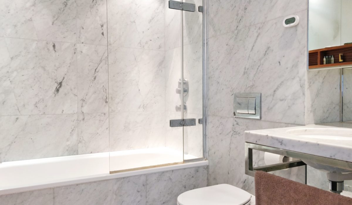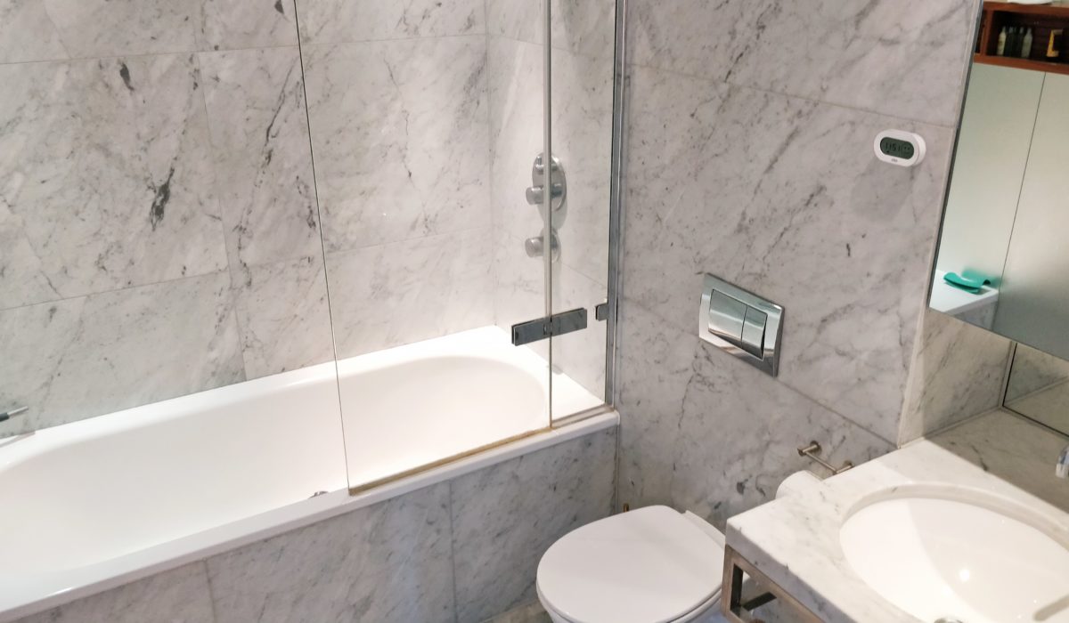 Luxury marble finished three piece bathroom suite containing low level flush WC, wash basin with chrome mixer tap, bathtub with mixer taps, shower attachment and glass splash screen, mirrored over-sink storage unit, heated towel rail.