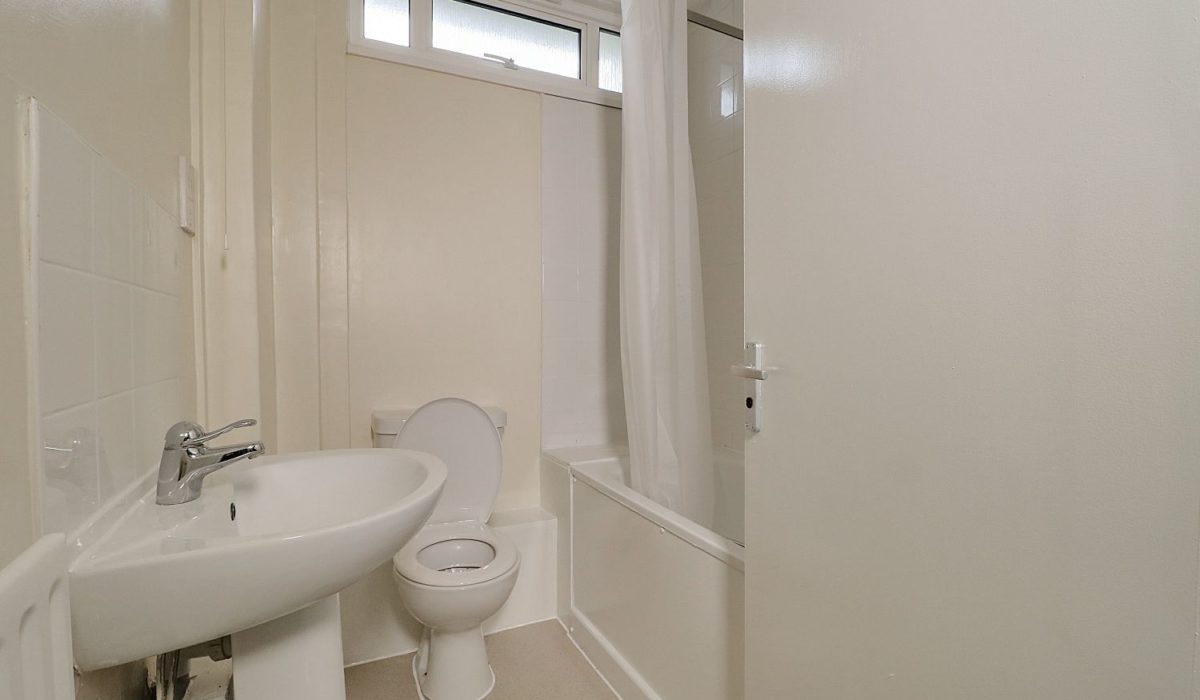Part tiled with vinyl flooring, bathtub with mixer taps and shower attachment, wash hand basin with mixer taps, low level flush WC, radiator, front aspect frosted window, light fitting, extractor fan.