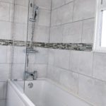 Modern 3 piece suite, fully tiled. Wash hand basin with mixer taps and under sink storage, bathtub with mixer taps, shower fittings and splash screen, low-level flush WC, radiator and side aspect frosted double glazed window.