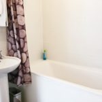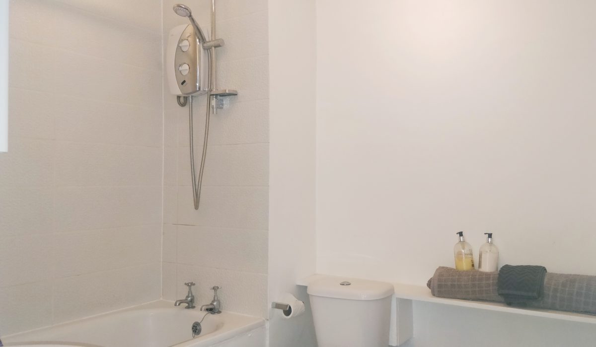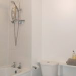 Tiled flooring, part-tiled walls, wash hand basin with mixer taps, Bathtub with separate taps and power shower fittings, low-level flush WC, heated towel rail and extractor.