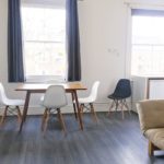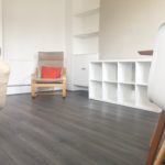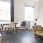 Open plan kitchen with range of eye level wall and base units, tiled flooring, part tiled walls, built-in oven/hob with extractor, light fittings and various power points and front aspect sash windows. Spacious living/dining area, laminate flooring, dining table and chairs, storage cupboard, 2 seater sofa, single arm chair and stools.
