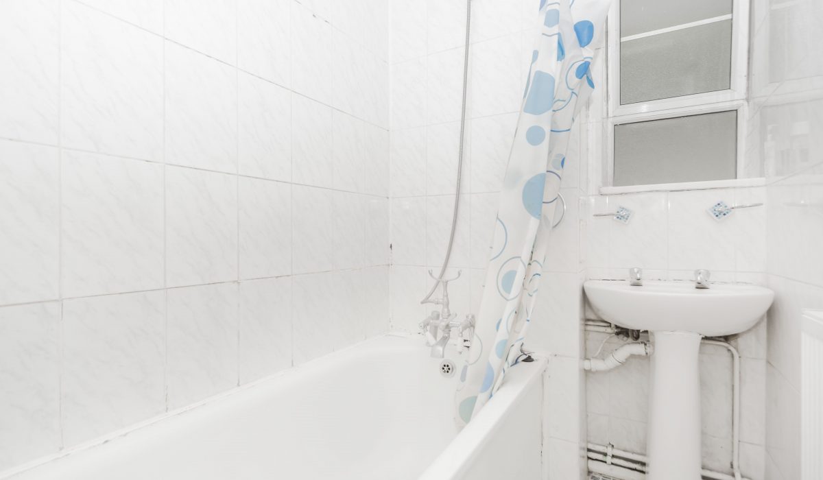 Front aspect, bath with shower head, separate hot/cold mixer tap, basin with separate hot/cold taps.