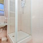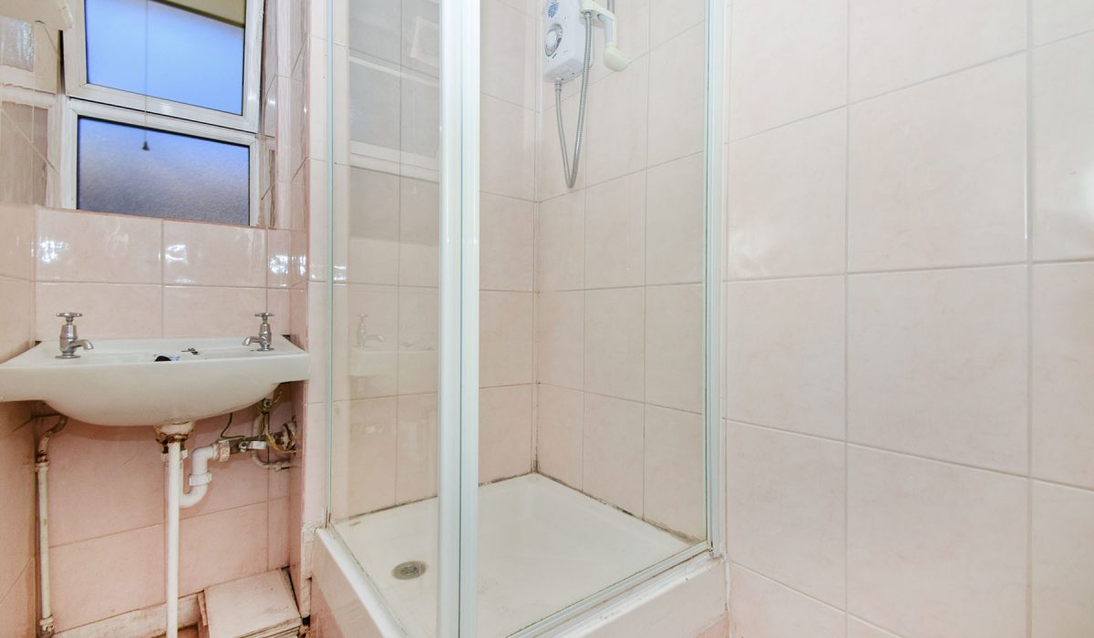 Front aspect, shower cubicle, single radiator, fully tiled, sink with separate hot/cold taps, small cupboard.
