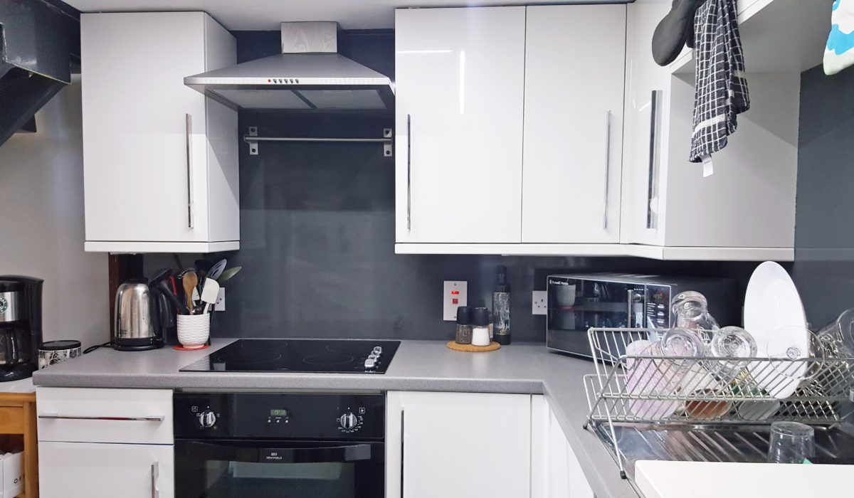 Open plan kitchen lounge with range of eye level wall and base units, tiled flooring, splash-back walls, integrated electric oven/hob, free-standing fridge freezer and washing machine.