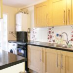 Laminate flooring with range of eye level wall and base units, part tiled walls, built-in electric oven/hob, light fittings and various power points.