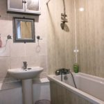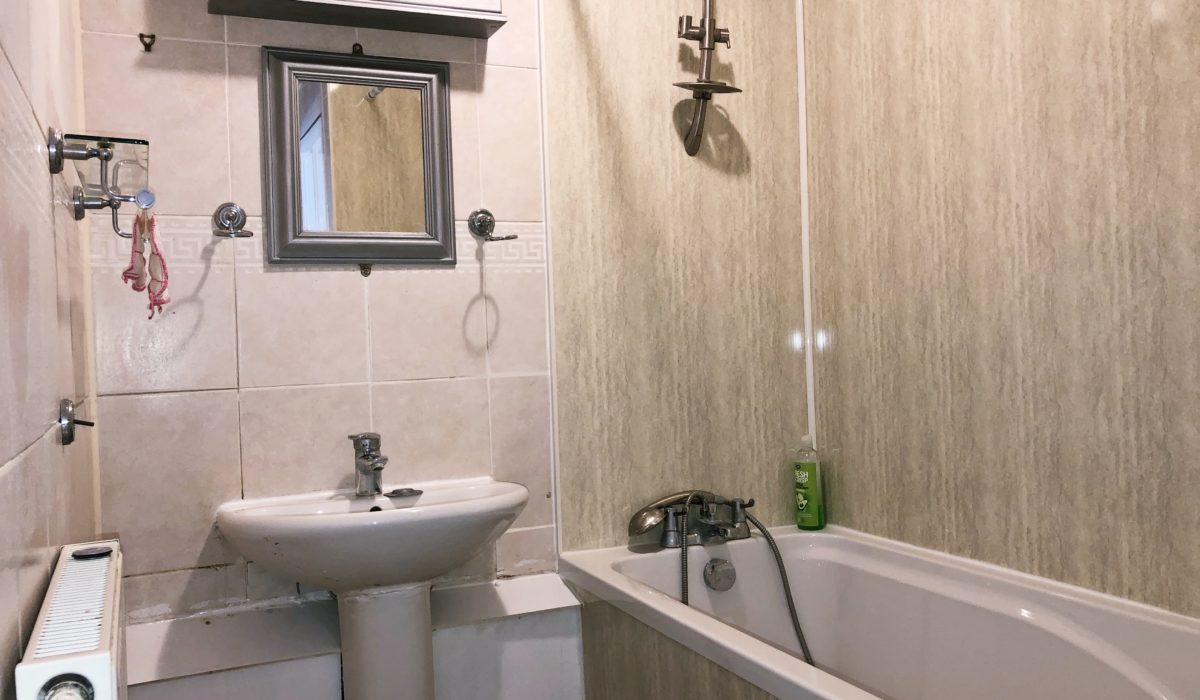 Fully tiled, wash hand basin with mixer tap, bathtub with shower attachment, radiator and storage unit.