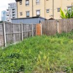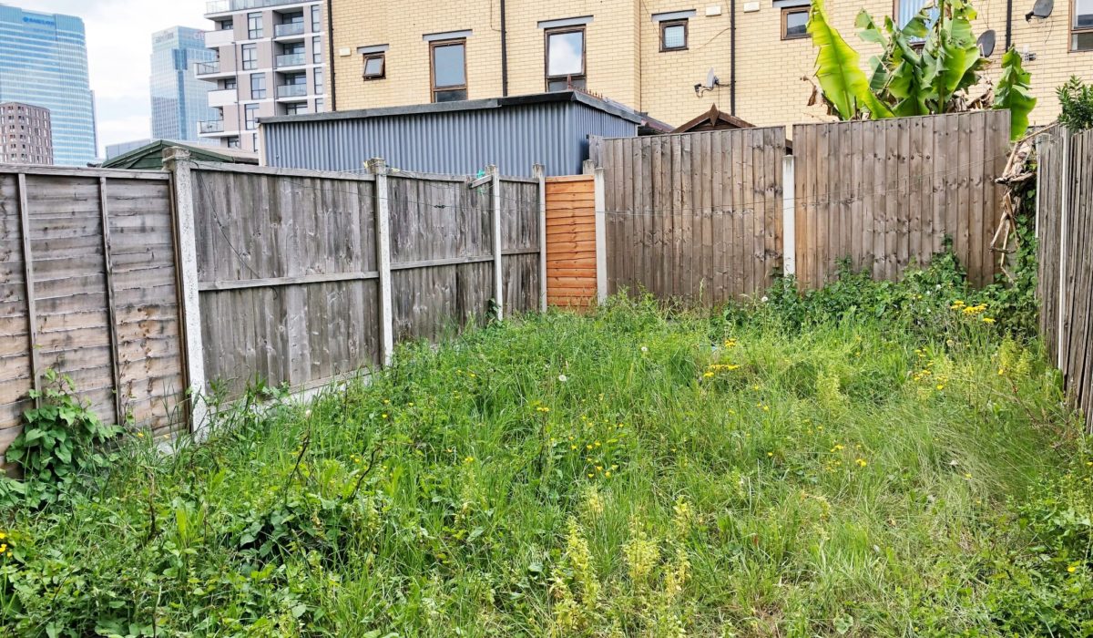 Part paved, part lawn with wooden fence surround.