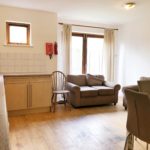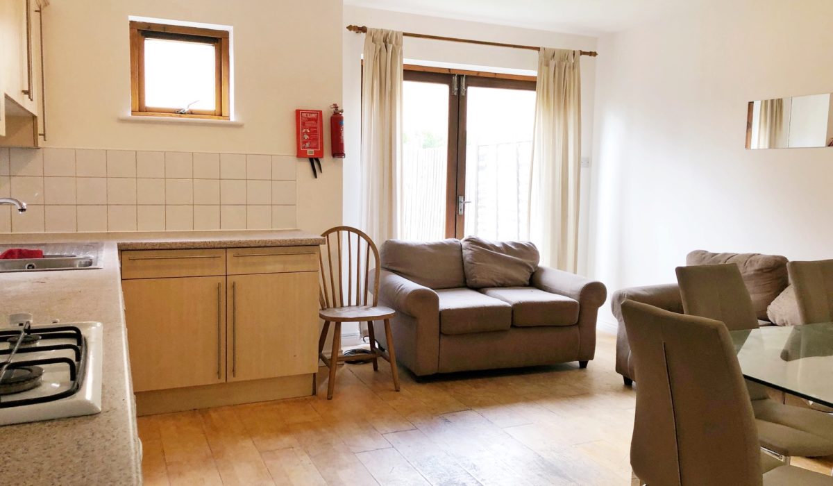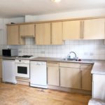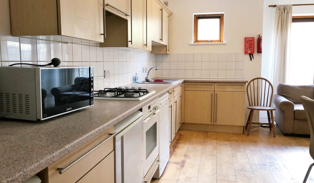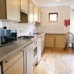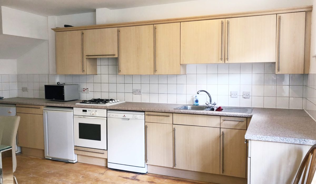 Fitted base and eye level unit, laminate worktop, gas cooker with extractor hood, part tiled walls, laminate flooring, stainless steel sink with mixer tap, washing machine, fridge freezer, dish-washer, various power points. Dining table and chairs, access to rear garden.
