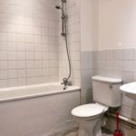 Vinyl flooring, part tiled walls, 3 piece bathroom suite, wash hand basin with mixer tap, low level flush WC, bathtub with shower fittings, radiator and extractor.
