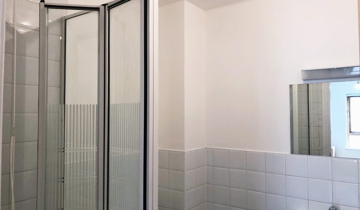 Part tiled three piece en-suite. Low level flush WC, wash basin with chrome mixer tap, shower cubicle, mirror, heated towel rail.
