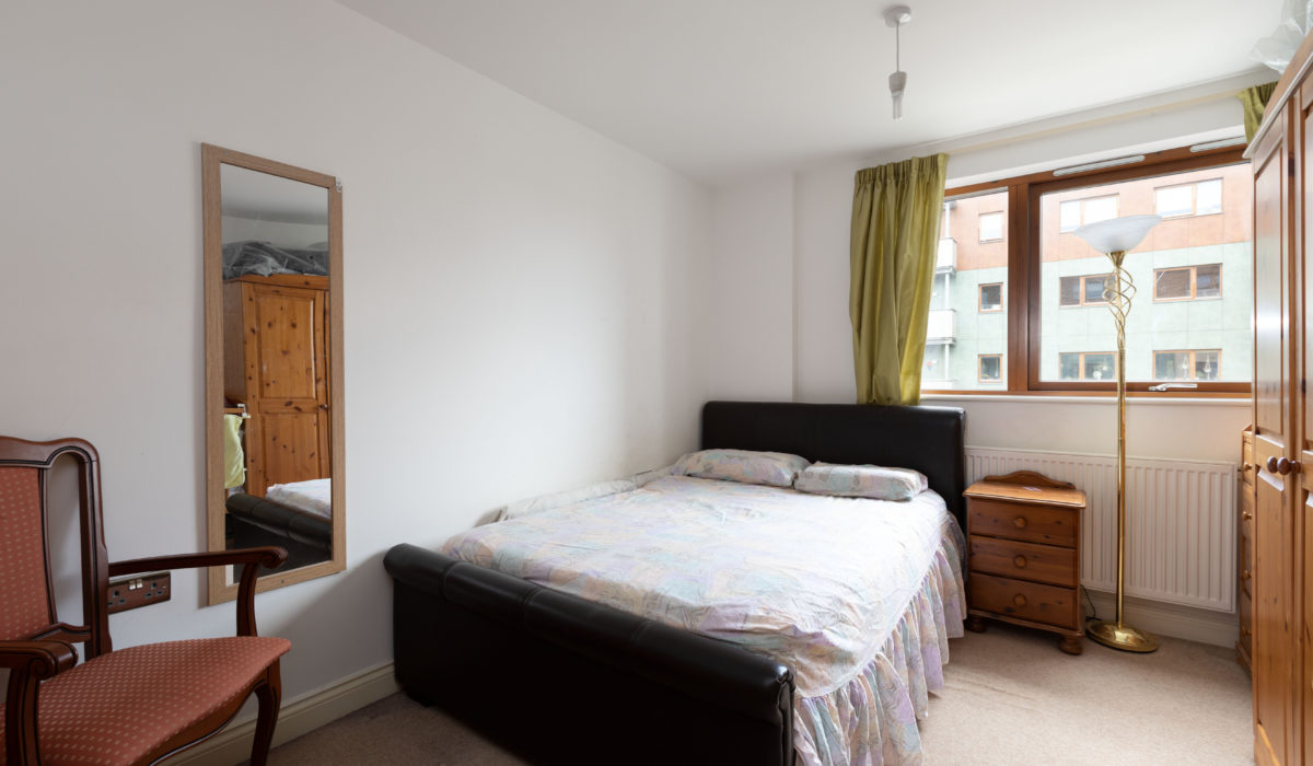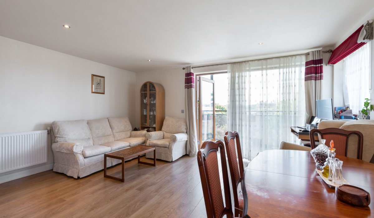 Laminate flooring throughout, radiator, various power points, light fitting, front aspect double glazed sliding doors giving access to a private balcony with views of the London skyline.