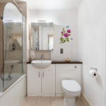 Three piece family bathroom, tiled flooring, part-tiled walls, bathtub with mixer tap, shower fittings and splash screen, wall hanging sink with mixer tap and storage, low level flush WC, heated towel rail and extractor.