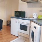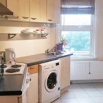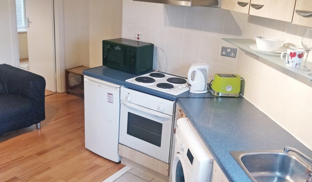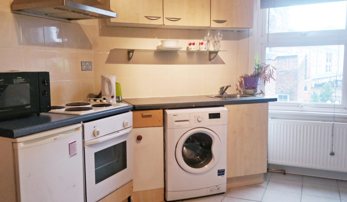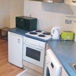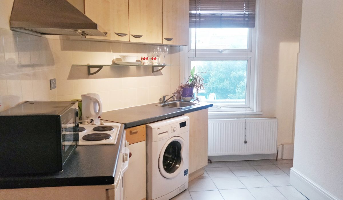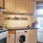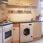 Rear aspect, electric cooker with extractor fan, various eye and low level units. Under counter washing machine and fridge, tiled floor with partially tiled walls, chrome mixer tap sink. Various power sockets, light fittings and storage cupboard.