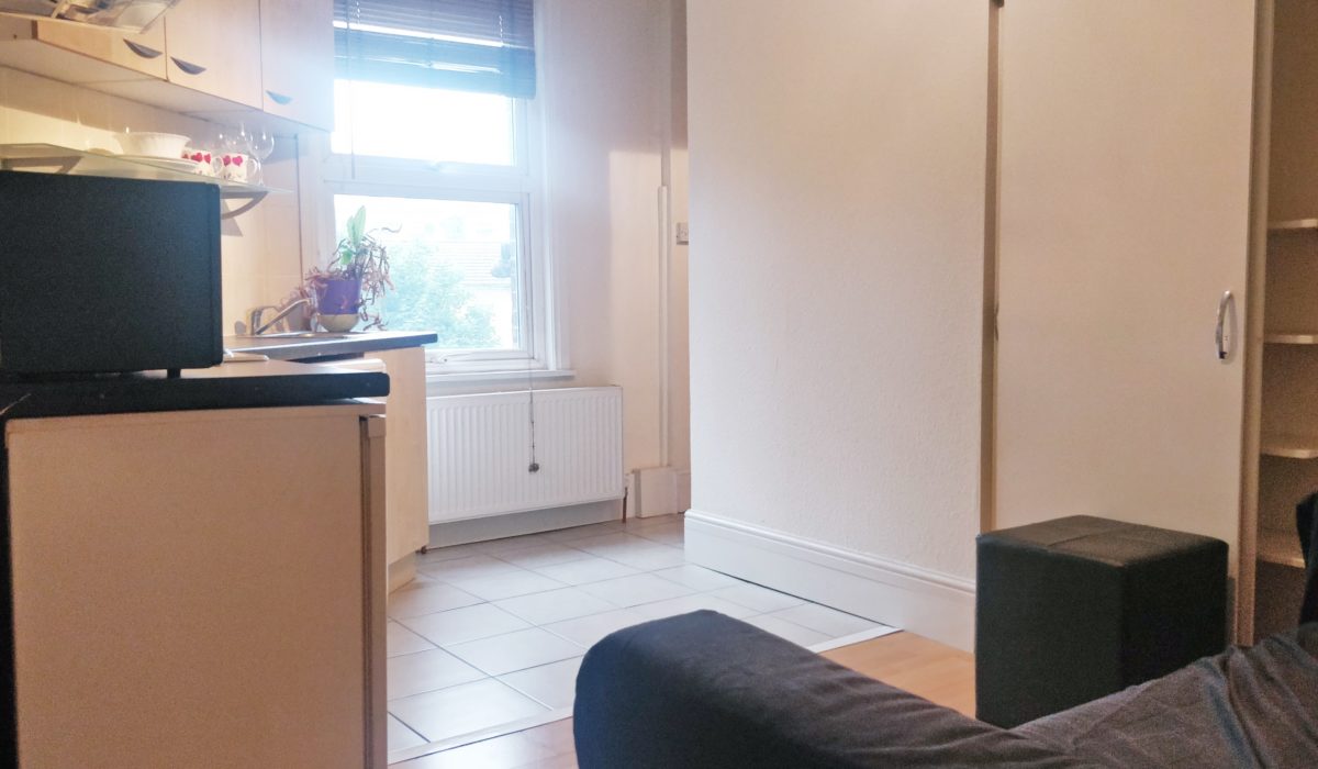 Entry via stairs to 2nd floor. Wood laminated floor, single radiator, access to bedroom, kitchen/diner and bathroom.