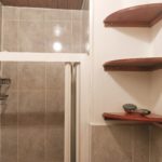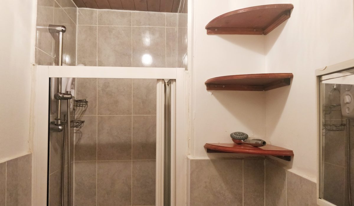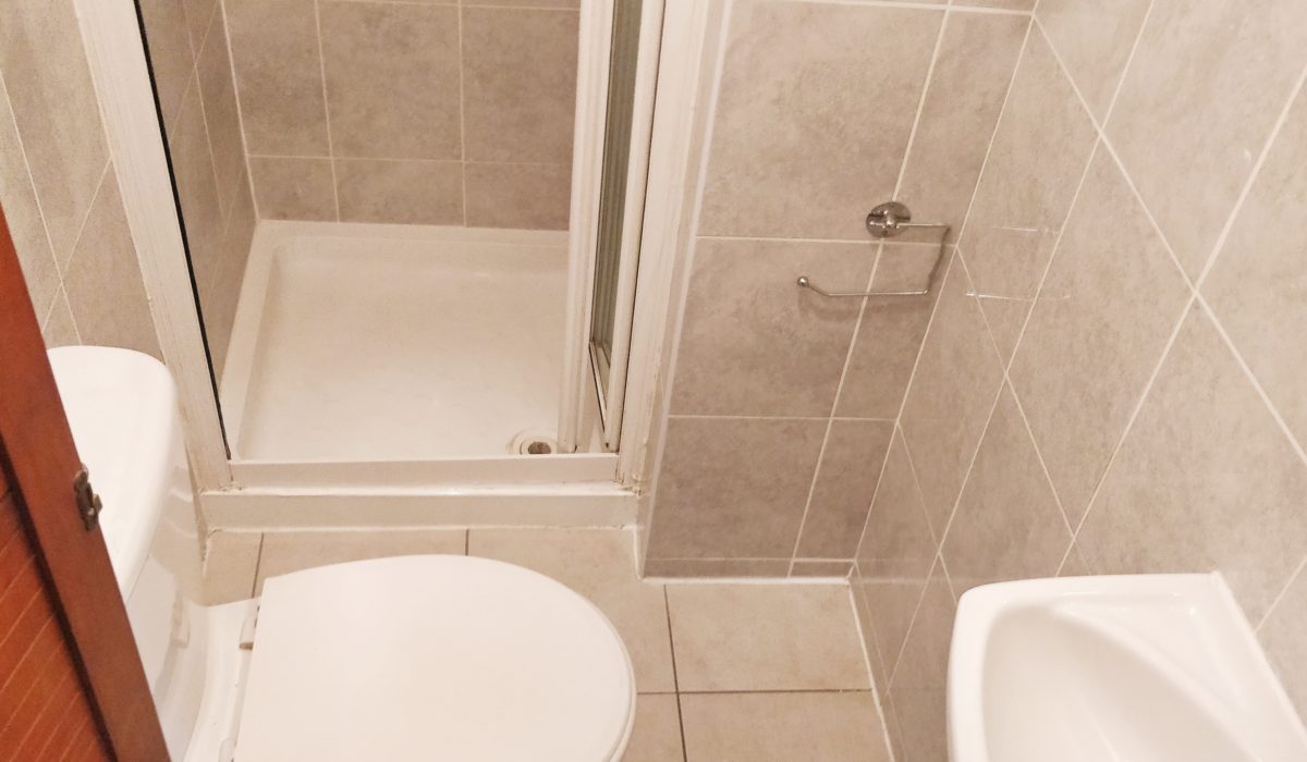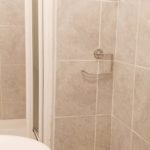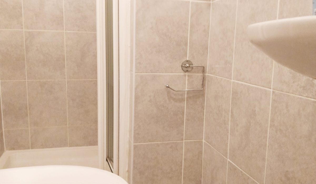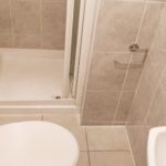 Shower cubicle, single radiator, fully tiled, sink with separate hot/cold taps, low level flush WC.