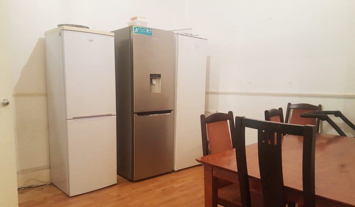 Dining table and chairs, double radiator, fridge freezer, laminate flooring throughout, radiator, various power points, light fitting.