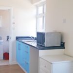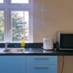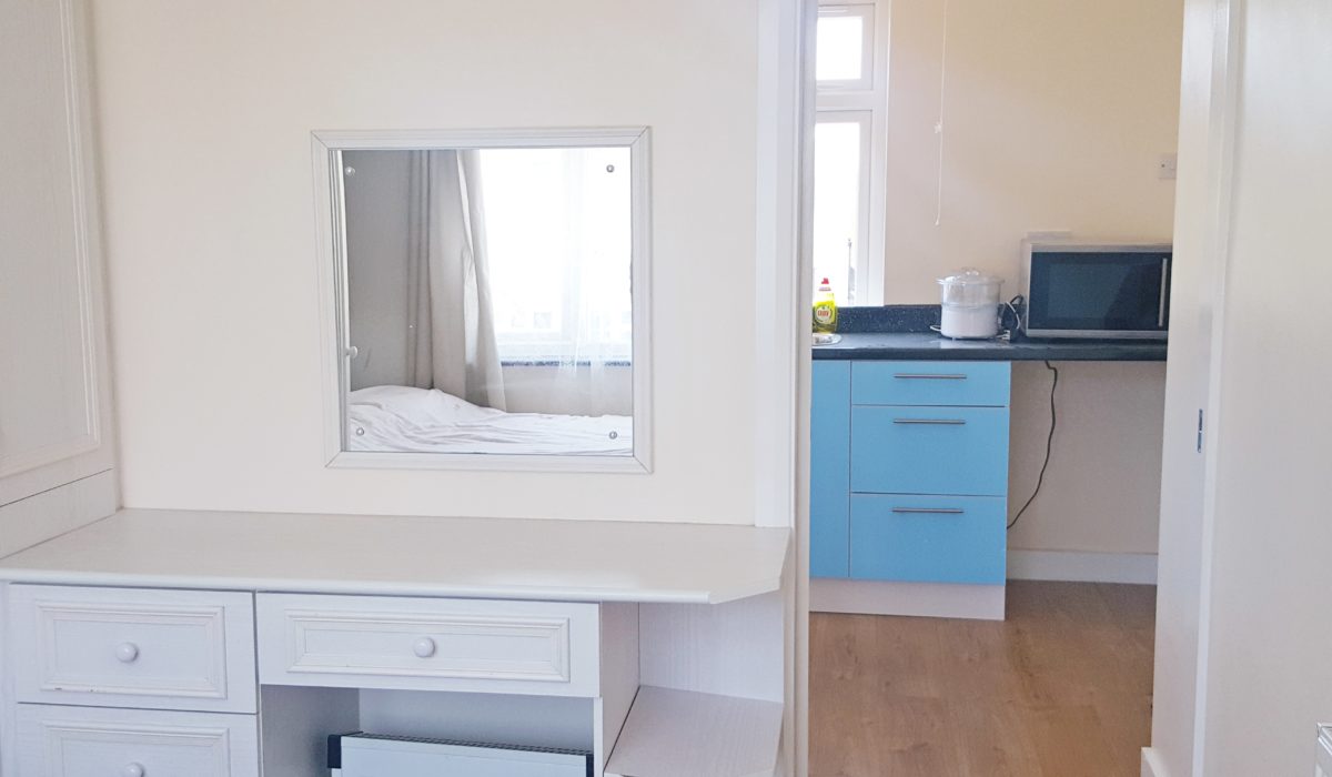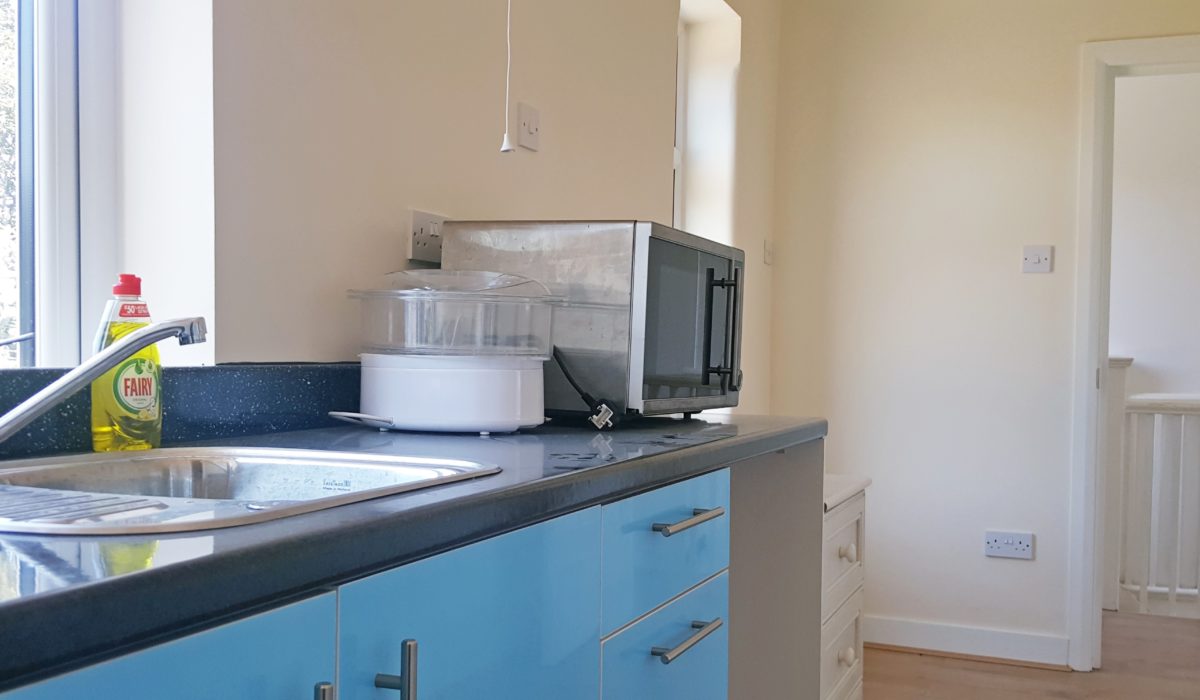 Laminate flooring, base level units, sink with mixer taps, electric cooker, free-standing fridge/freezer, dining table and chairs, rear aspect double glazed window. Access to bedroom and shower room.