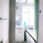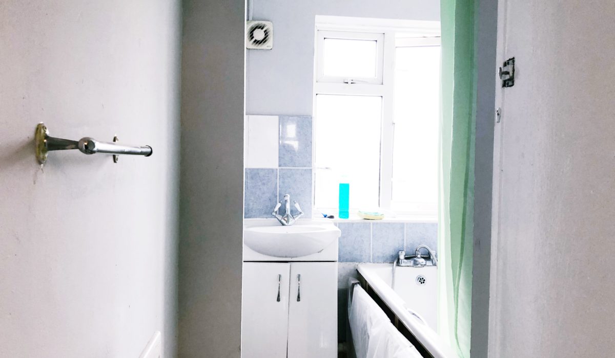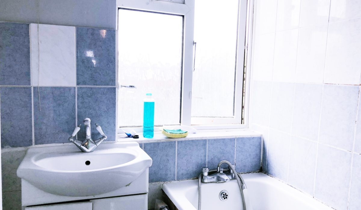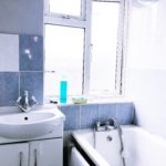 Bath with mixer taps, Sink with separate mixer taps with under storage. Tiled flooring and part tiled walls.