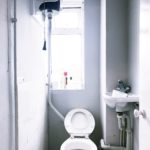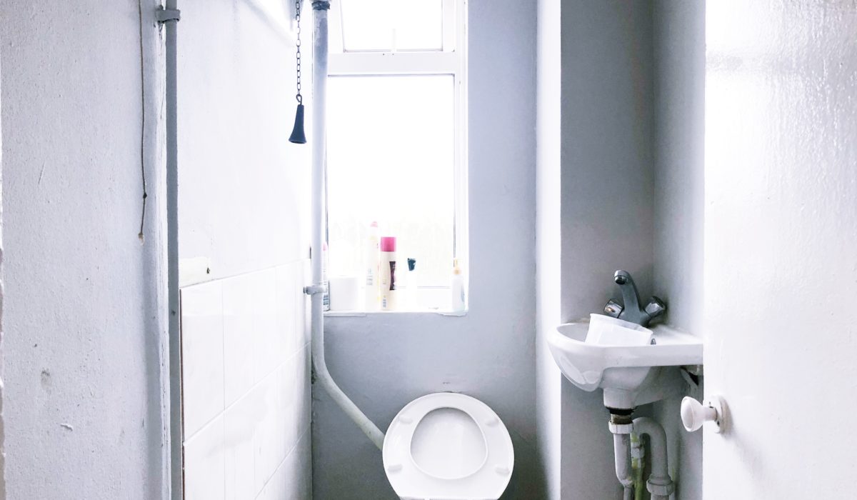 Toilet with high level flush, tiled flooring