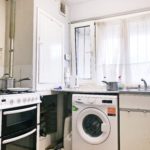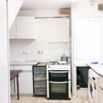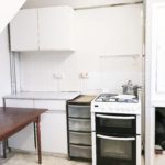 Free standing cooker, stainless steel sink with mixer tap, Eye and base level storage units, tile flooring, Various power sockets