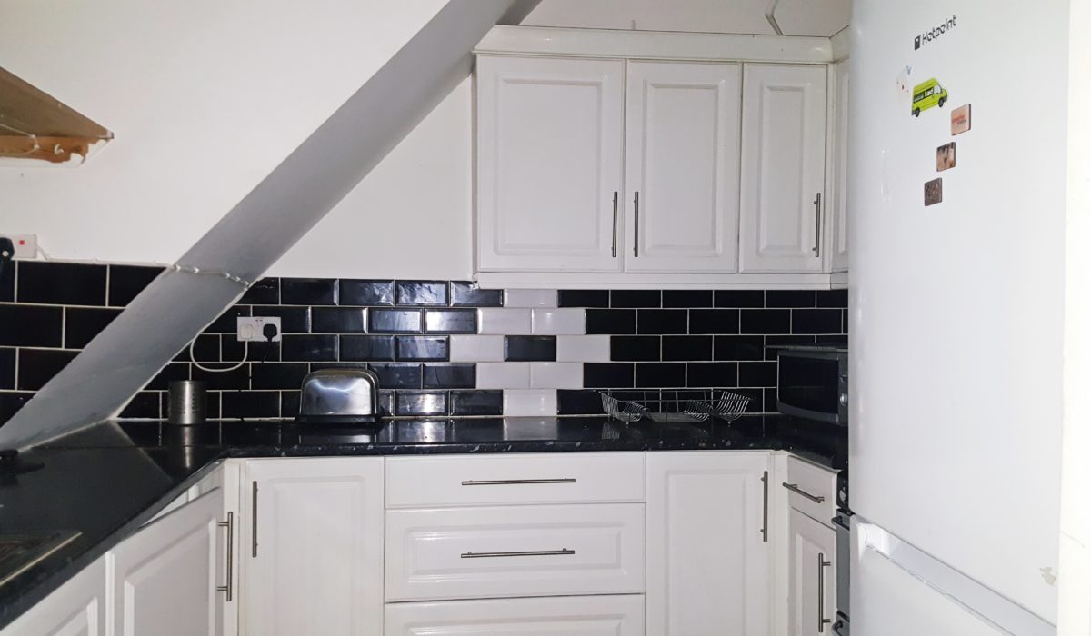 Lino flooring and part tiled walls. Modern fitted kitchen with eye and base level units, stainless steel sink with mixer tap, free-standing gas cooker with extractor, free-standing fridge freezer, washing machine, various power points and light fitting.