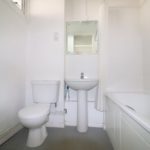 Part tiled with vinyl flooring, bathtub with mixer taps and shower attachment, hand wash basin with mixer taps, low level flush WC, radiator, front aspect frosted window, light fitting and extractor fan.
