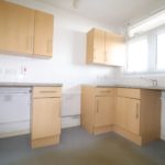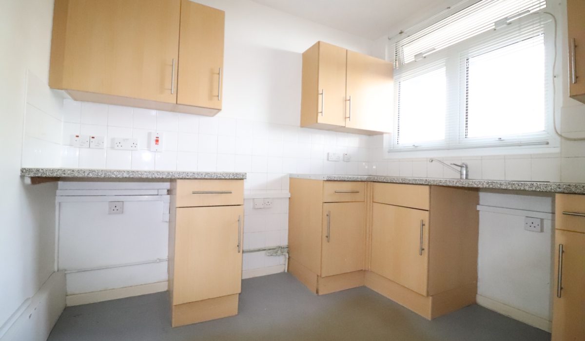 Vinyl flooring, range of base and eye level units, part tiled walls, sink with mixer taps, front aspect double glazed window, power points and light fittings, plumbing for gas cooker, free-standing washing machine.