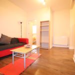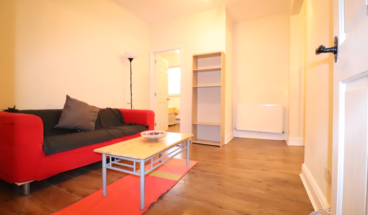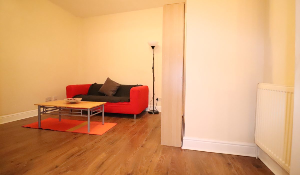 Laminate flooring throughout, single radiator, 2 seater sofa, coffee table and bookshelf. Various power points and light fitting.