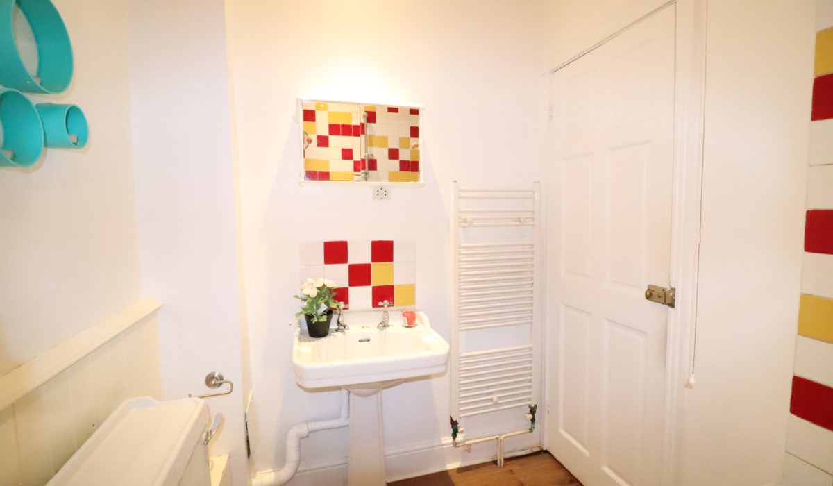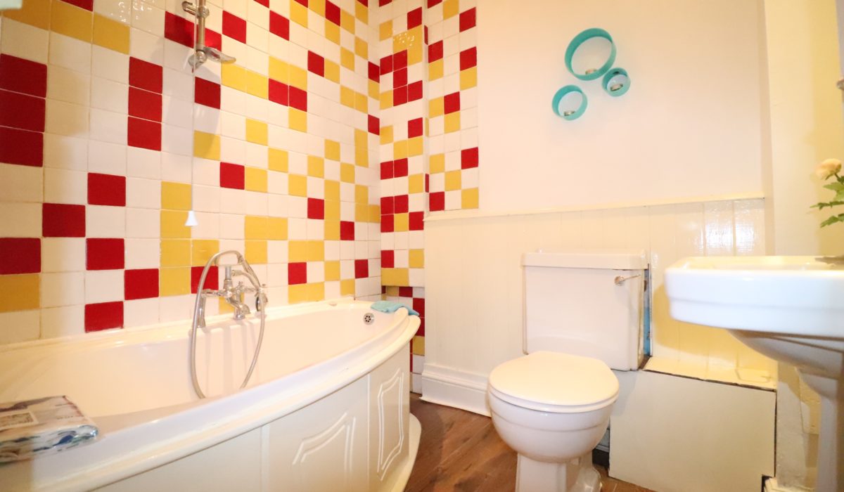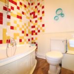 3 piece suite, part tiled, corner bath with shower fittings, low level flush WC, ceramic hand wash basin with separate taps. Heated towel rail and storage mirror unit.