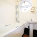 Part tiled with vinyl flooring, bathtub with mixer taps and shower attachment, hand wash basin with mixer taps, low level flush WC, radiator, side aspect frosted window, light fitting and extractor fan.