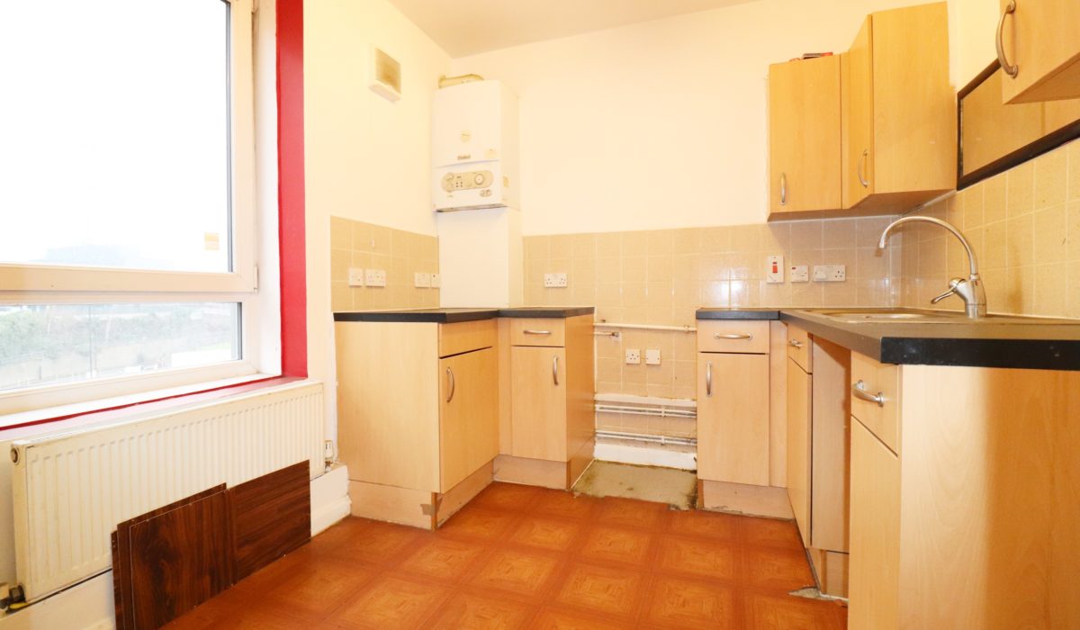 Vinyl flooring, range of base and eye level units, part tiled walls, sink with mixer taps, front aspect double glazed window, power points and light fittings, plumbing for gas cooker, free-standing washing machine.