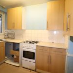 Vinyl flooring, range of base and eye level units, part tiled walls, sink with mixer taps, front aspect double glazed window, power points and light fittings, plumbing for gas cooker, free-standing washing machine.