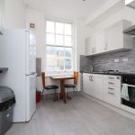Part tiled walls, tiled flooring. Base and eye level fitted units, built-in electric oven and hob, sink with mixer taps, radiator, free standing fridge freezer and washing machine, dining table and chairs. Rear aspect sash windows.
