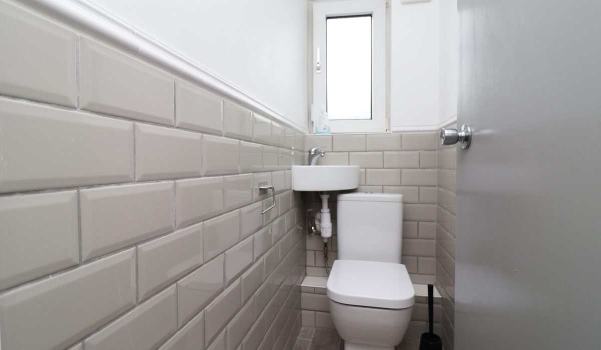 Tiled Flooring, part tiled walls, low-level flush WC, wall hung hand wash basin with mixer tap, obscure double glazed window.