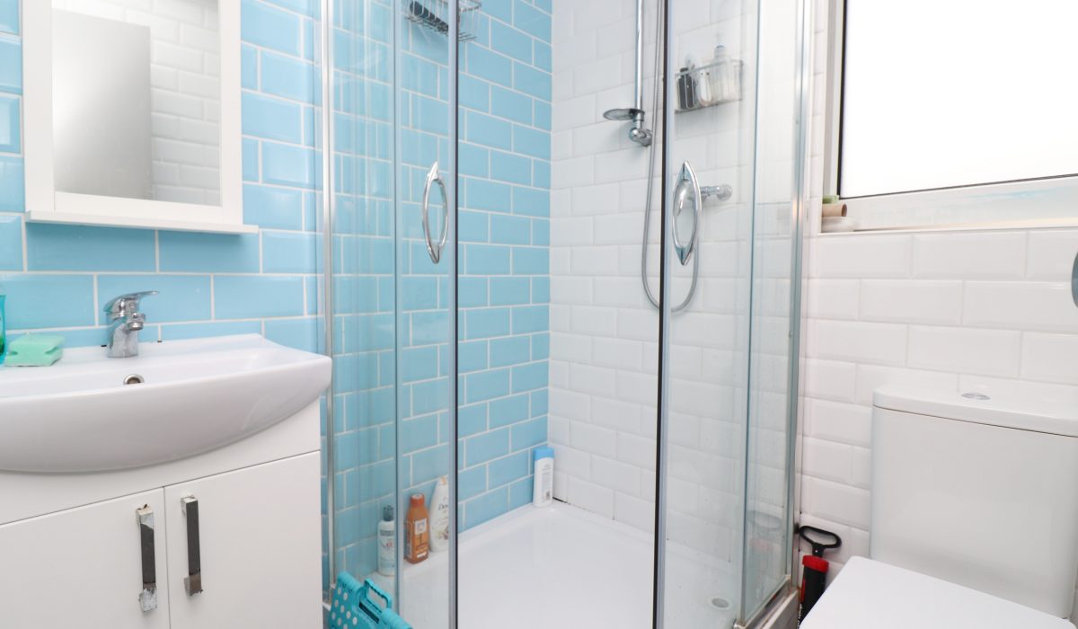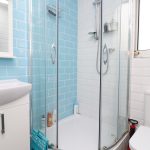 Tiled flooring, part tiled walls, shower cubicle, wash hand basin with mixer taps, low level flush WC, eye-level mirror, light fitting.