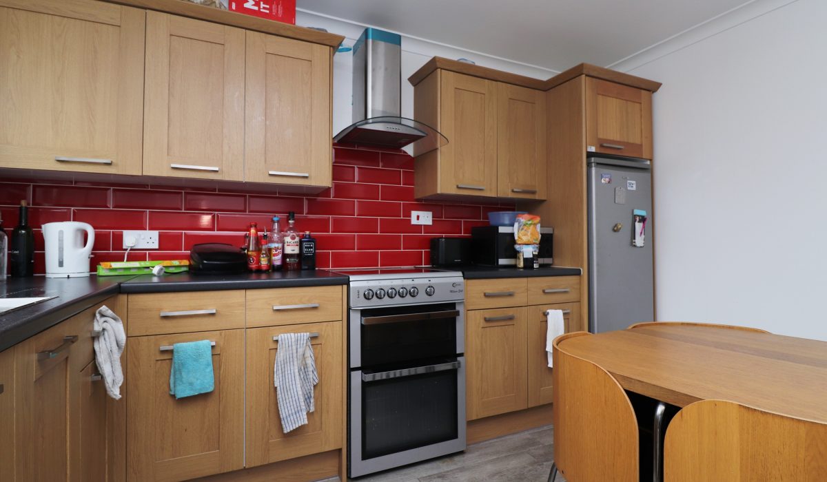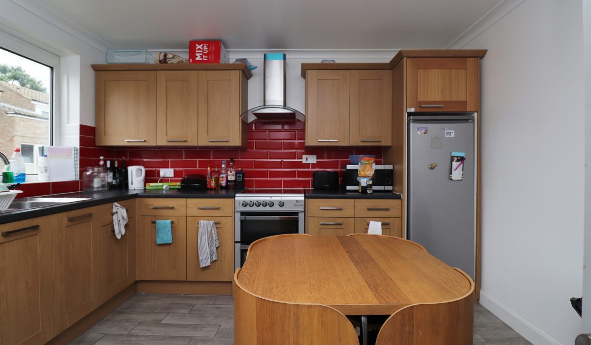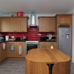 Part tiled walls, tiled flooring. Base and eye level fitted units, sink with mixer taps, radiator, fridge freezer, washing machine, dining table and chairs.