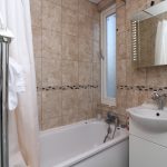 Fully tiled, 3 piece bathroom, single radiator, sink with a mixer tap and storage, bath with shower head attachment and mixer tap, low level flush WC. Obscure double glazed window and light fitting.