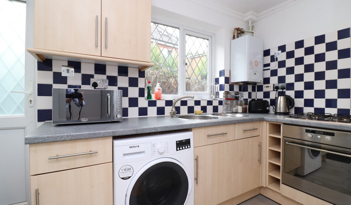 Range of eye level wall and base units, tiled flooring, part tiled walls, built in gas hob and oven plus extractor fan, stainless steel sink with drainer and mixer tap overlooking rear garden, freestanding washing machine and fridge freezer, rear aspect double glazed windows, various power points and light fittings.