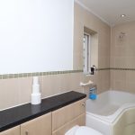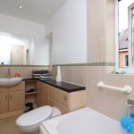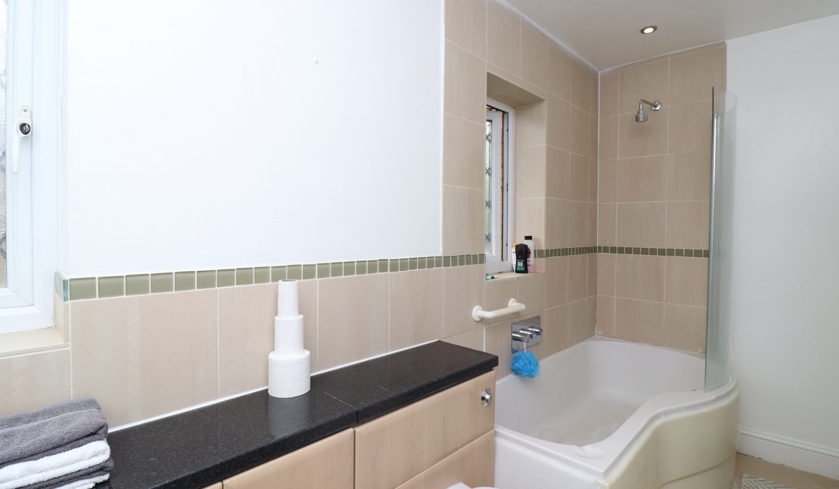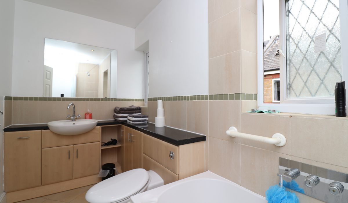 3 piece bathroom suite, tiled flooring and part tiled walls, wash hand basin with mixer taps and storage, low level flush WC, bathtub with mixer taps and shower attachment. Side aspect: obscure double glazed window.