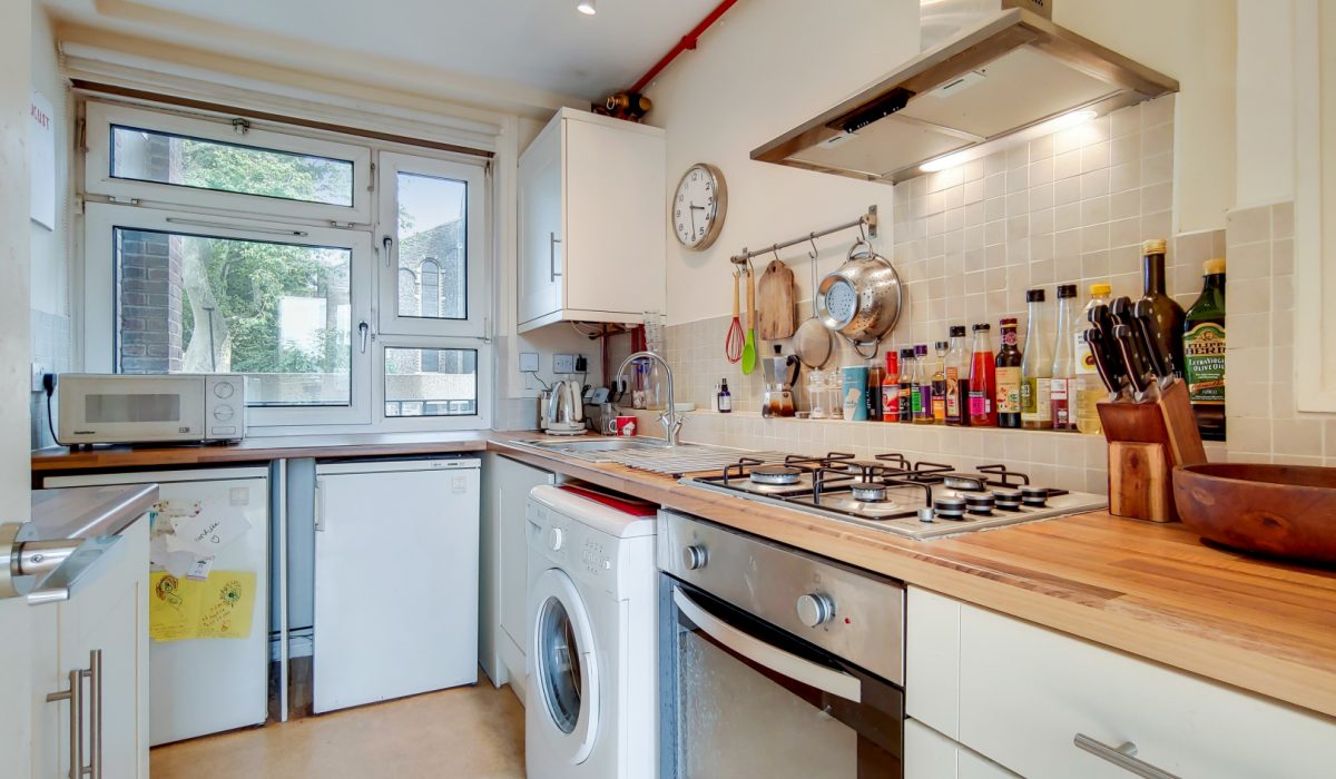 Fitted kitchen with lino flooring, part tiled, stainless steel sink. The kitchen comes with an integrated gas hob with an electric oven and extractor fan, space for washing machine and fridge/freezer and sink with mixer taps. Furthermore, range of eye level cabinets and base units. The kitchen provides a direct view of St Peter's Church.