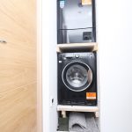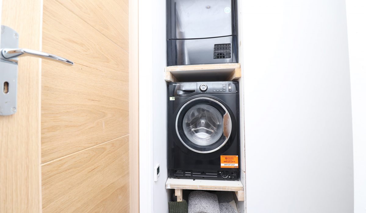Built in Utility Room with a washer and dryer, built in cupboard, carpeted.