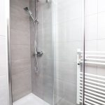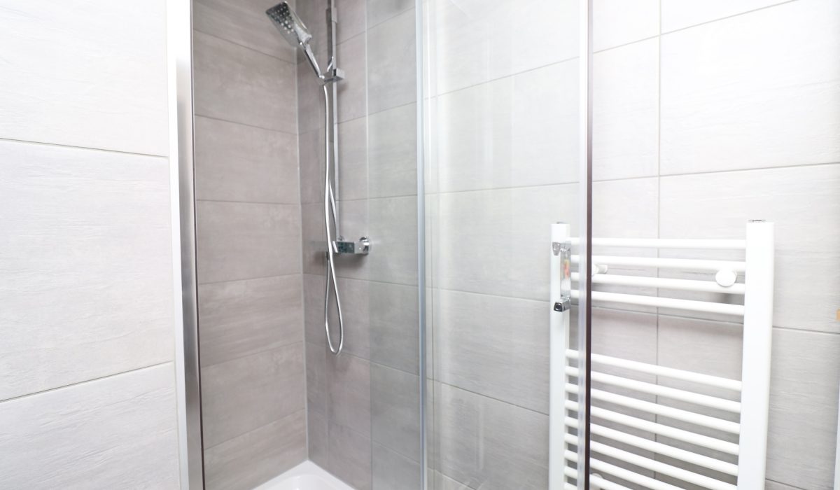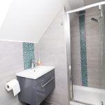 Closed shower, single mixer tap sink, wash basin with a mixer tap, floating low level WC, heated towel rack, fully tiled floor and walls and apex double glazed windows