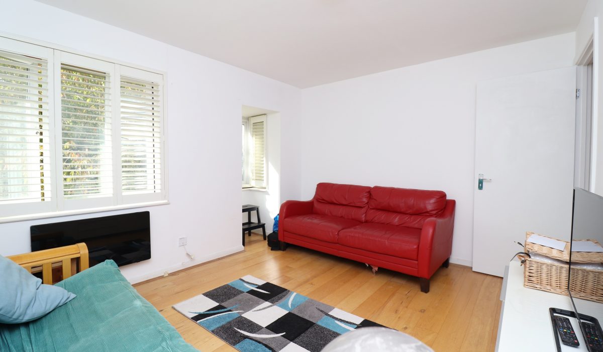 1x Leather sofa, 1x wooden sofa, TV cabinet, TV, Double glazed front aspect windows with shutters, wood flooring.