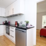 Sink mixer tap and drainer. Induction cooker, oven and integrated microwave. Various cupboard units at base and eye level. Free standing fridge freezer. Double glazed window and various power sockets. Granite worktop and wood flooring.