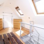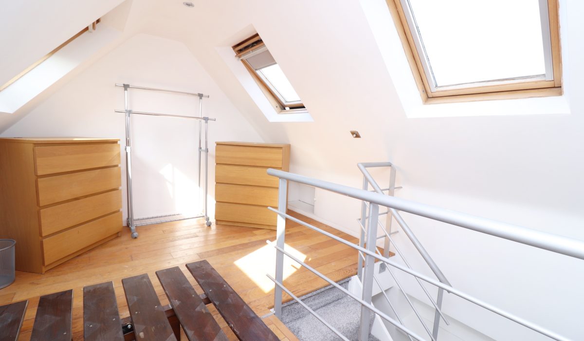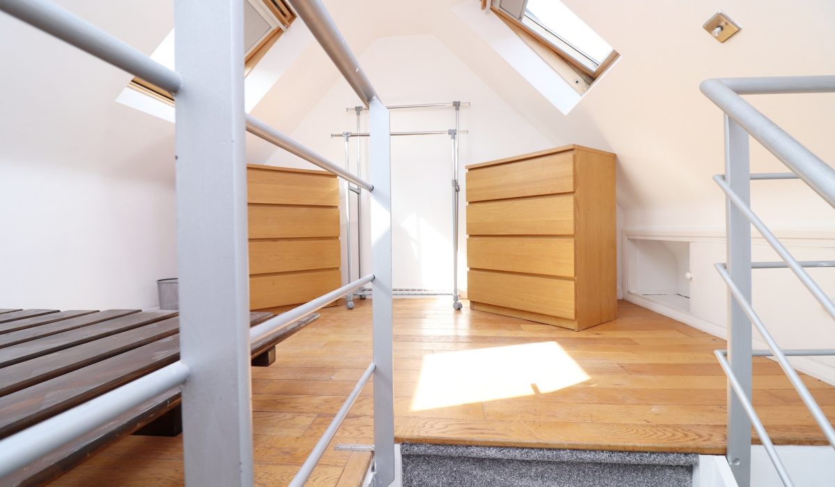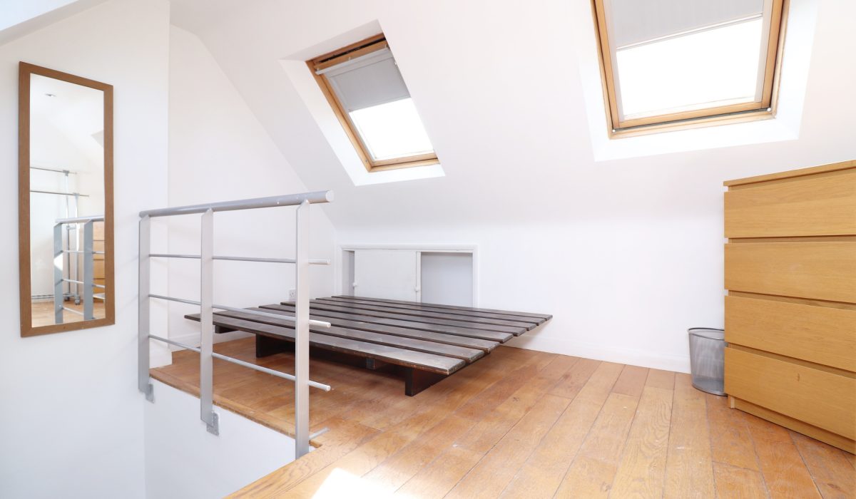 Double bedroom. Wooden bed base, built in storage, two chest of drawers, clothes rack, dual aspect v-lux windows with pull down blinds, original wood flooring.