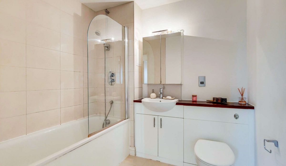 Three piece family bathroom, tiled flooring, part-tiled walls, bathtub with mixer tap, shower fittings and splash screen, wall hanging sink with mixer tap and storage, low level flush WC, heated towel rail and extractor.