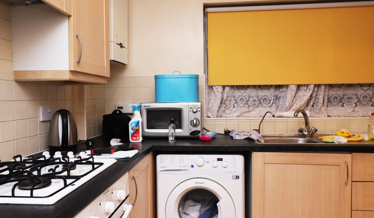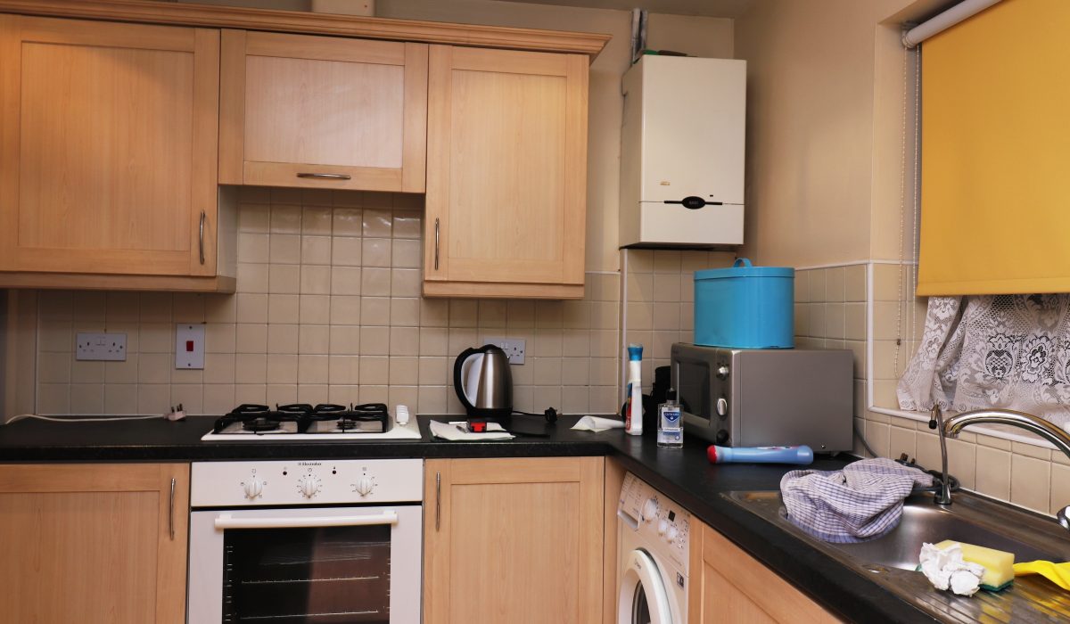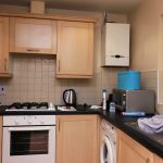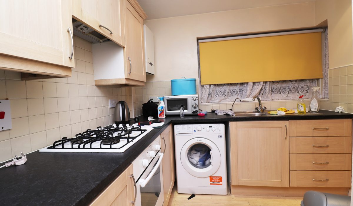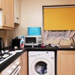 Range of base and eye level units, built-in four-knob gas cooker and oven, washing machine, and microwave. Laminate flooring, part tiled walls.