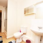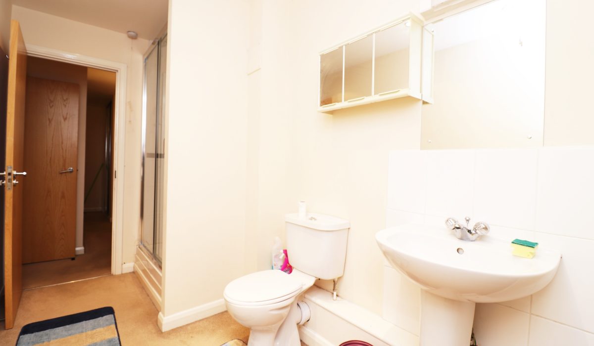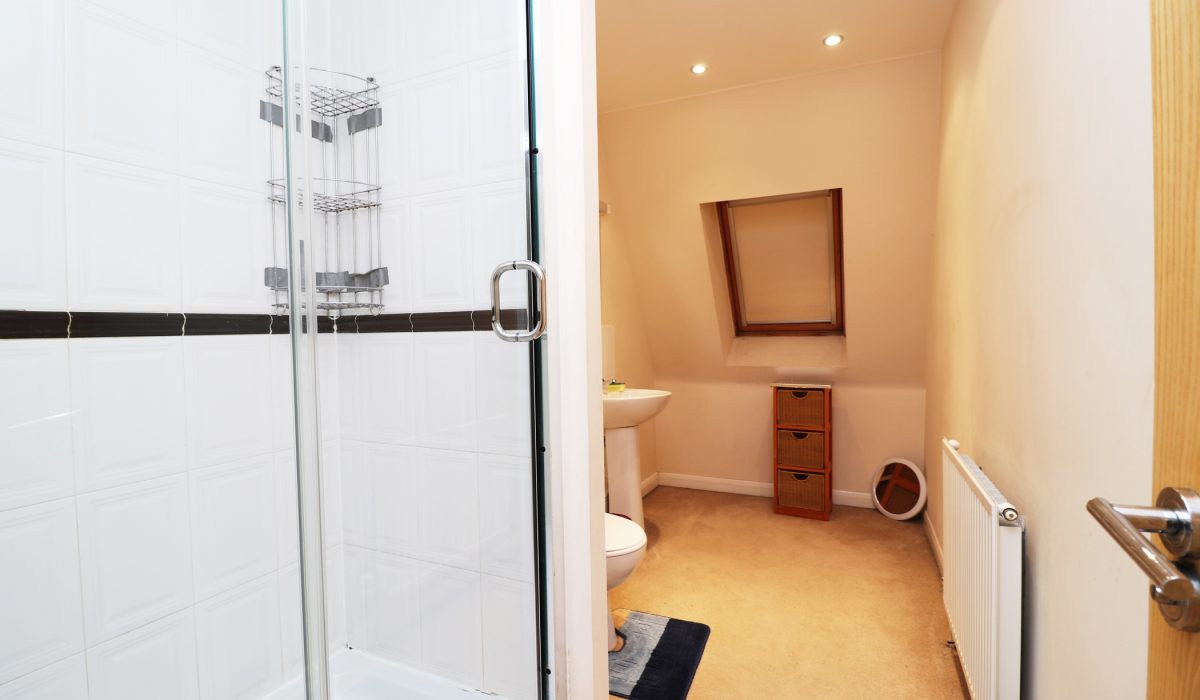 Three-piece shower suite, washbasin, low-level flush WC, shower encasement. Carpeted.