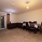 Door leading to the Garden, sofa, table, and chairs. Carpeted.